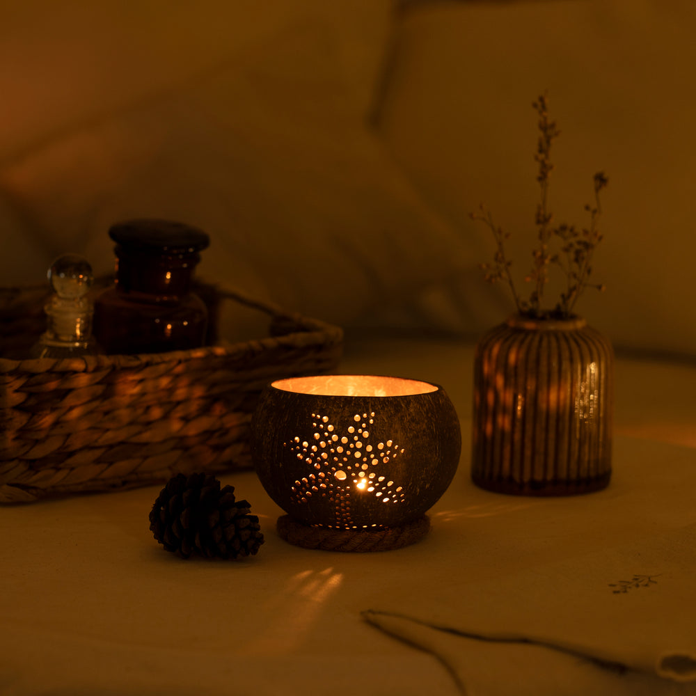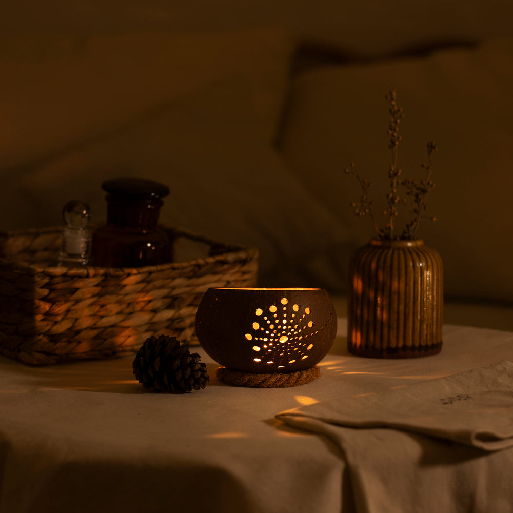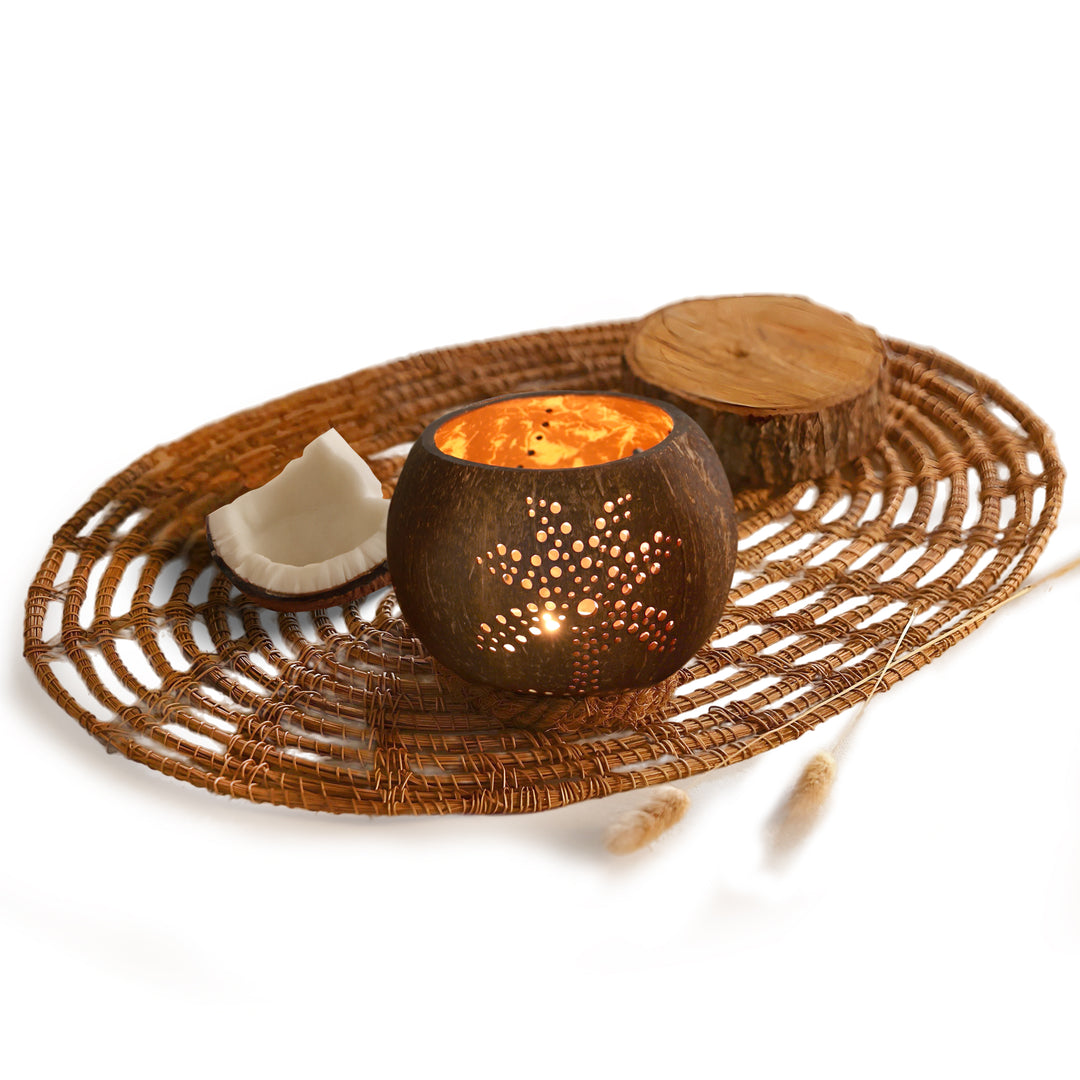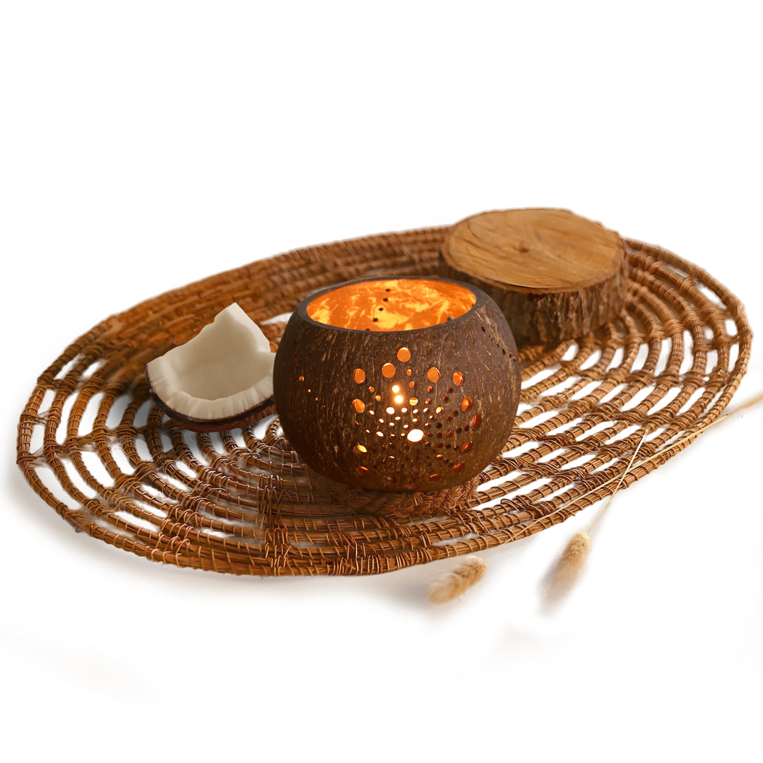 Willkommen bei Namtures Kokosnuss-Kerzenhalter-Kollektion. Diese einzigartigen, handgefertigten Kerzenhalter bringen einen Hauch von Natur und rustikalen Charme in Ihr Zuhause. Hergestellt aus echten Kokosnussschalen sind sie nicht nur eine stilvolle Ergänzung für Ihr Interieur, sondern auch eine nachhaltige Alternative zu herkömmlichen Kerzenhaltern. Jeder Kerzenhalter ist ein Unikat mit subtilen Variationen in Form und Struktur, die jedem Raum eine natürliche und warme Ausstrahlung verleihen.