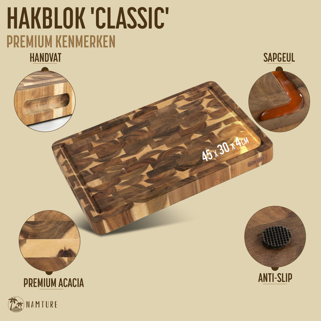 Het hakblok is gemaakt van duurzaam acaciahout, bekend om zijn robuustheid en natuurlijke uitstraling. Dankzij het opvallende eindnerfpatroon is elk exemplaar uniek. Het hout is van nature vochtbestendig en bestand tegen krassen, waardoor het blok jarenlang meegaat, zelfs bij dagelijks gebruik.